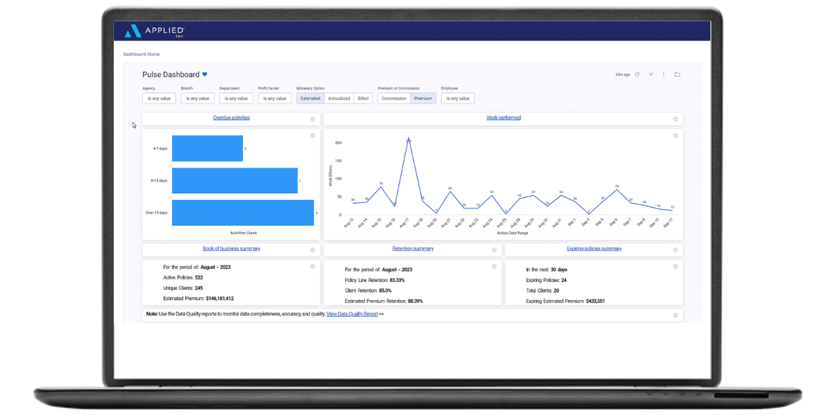 Transform your raw data into meaningful visualizations specific to your role. Epic® Dashboards is an out-of-the-box reporting and analytics tool directly embedded in Applied Epic Browser. These persona-based dashboards drill into the data important to each person’s role at your agency and present it in an easy-to-understand graphical interface that they can double-click to learn details about sales performance, operational capacity, and more.